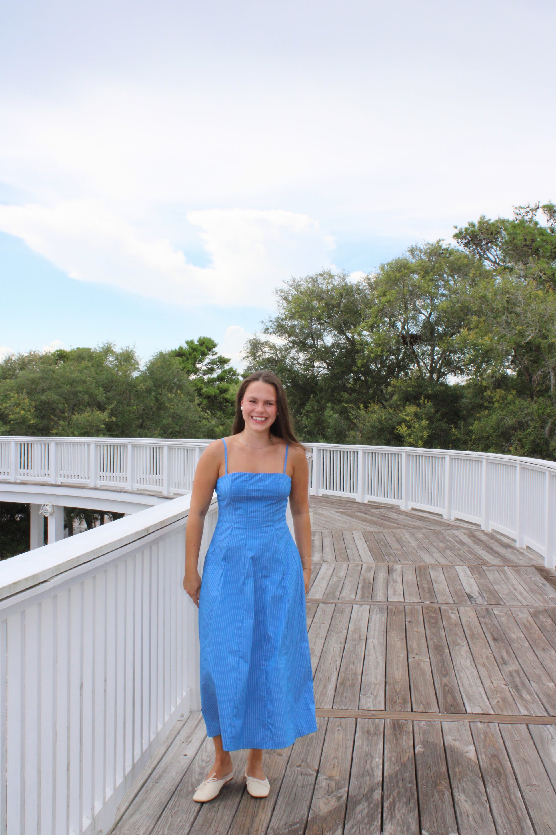 Blue pinstripe maxi dress that comes in at the waist to make the dress flattering. Breathable material perfect for the summer.