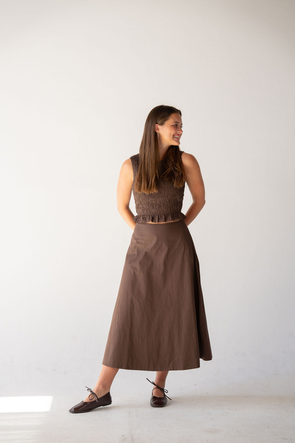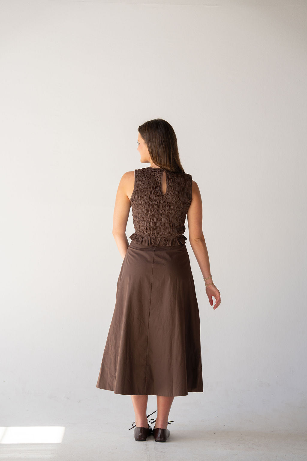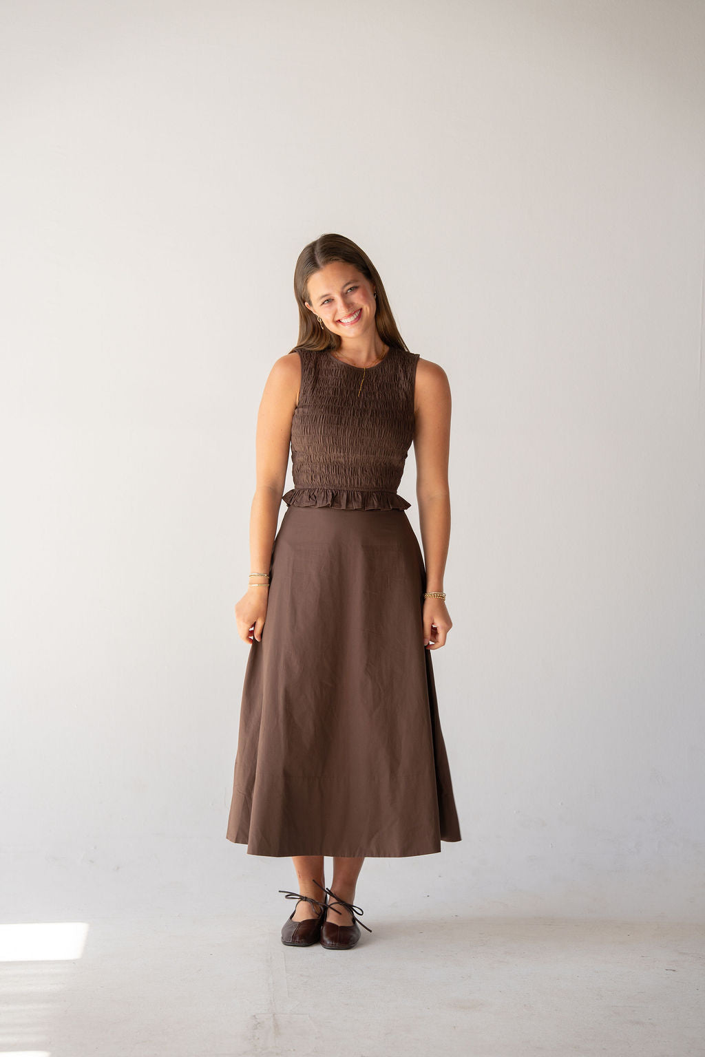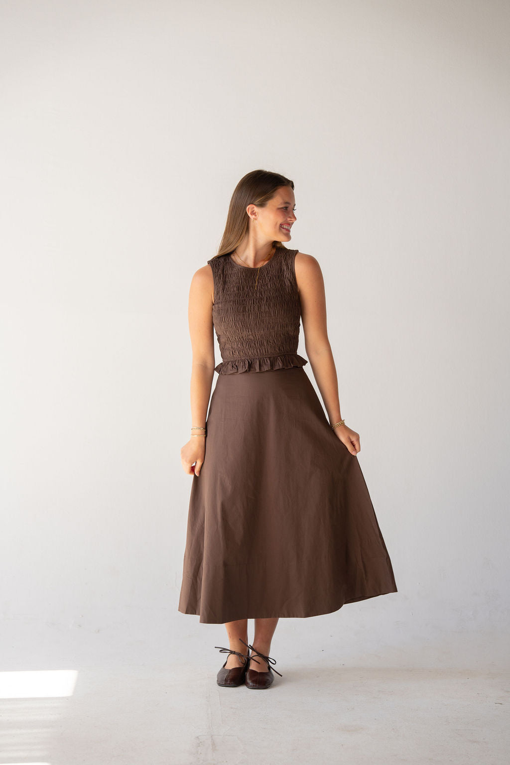 Soft structure meets effortless femininity in this rich brown set. Featuring a smocked fitted top with delicate ruffle detail and a flowy midi skirt, this set is both timeless and easy to wear. The warm brown tone makes it a perfect neutral for spring — pair together for a polished look or wear as separates all season long.