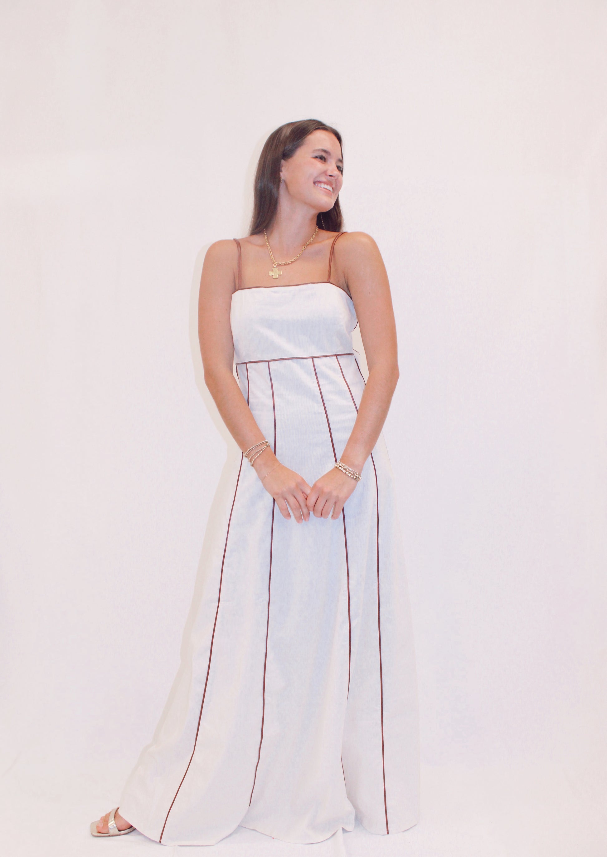Featuring a fitted bodice with a square neckline and adjustable spaghetti straps, this dress offers a flattering and supportive silhouette. Ideal for summer gatherings, garden parties, or coastal getaways, this dress blends structure and softness for a timeless yet contemporary statement.