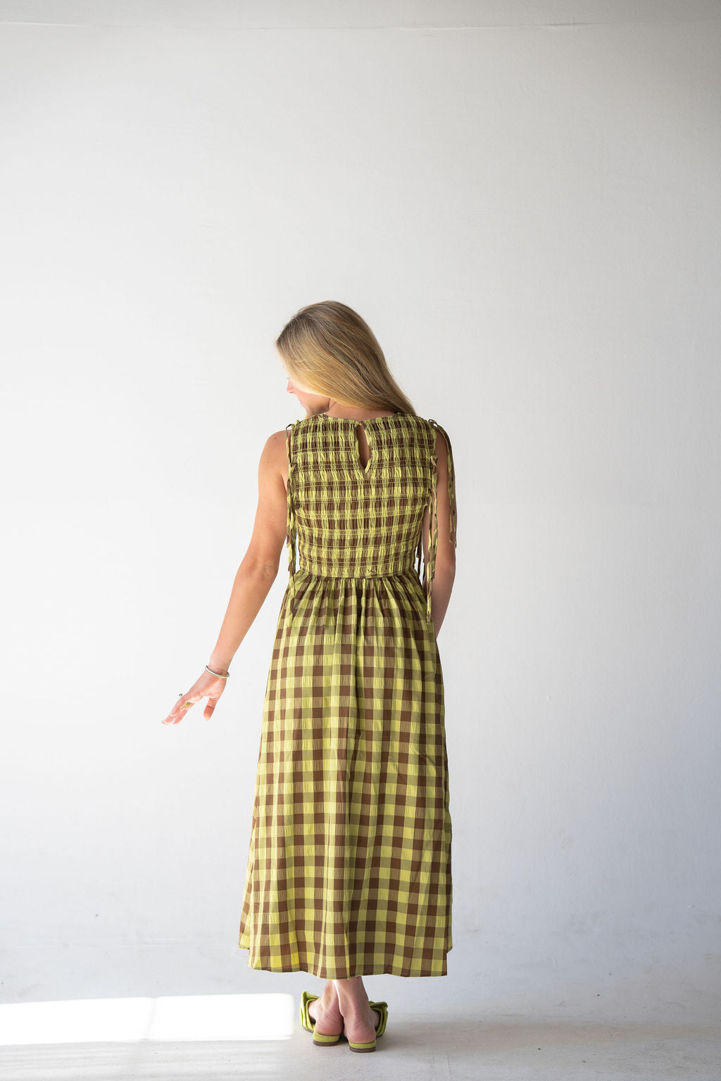 Sweet with a hint of structure—the Honey Matcha Spritz Dress is your answer to effortless spring dressing. Designed in a soft green and brown gingham, this piece blends earthy tones with a fresh, feminine feel.